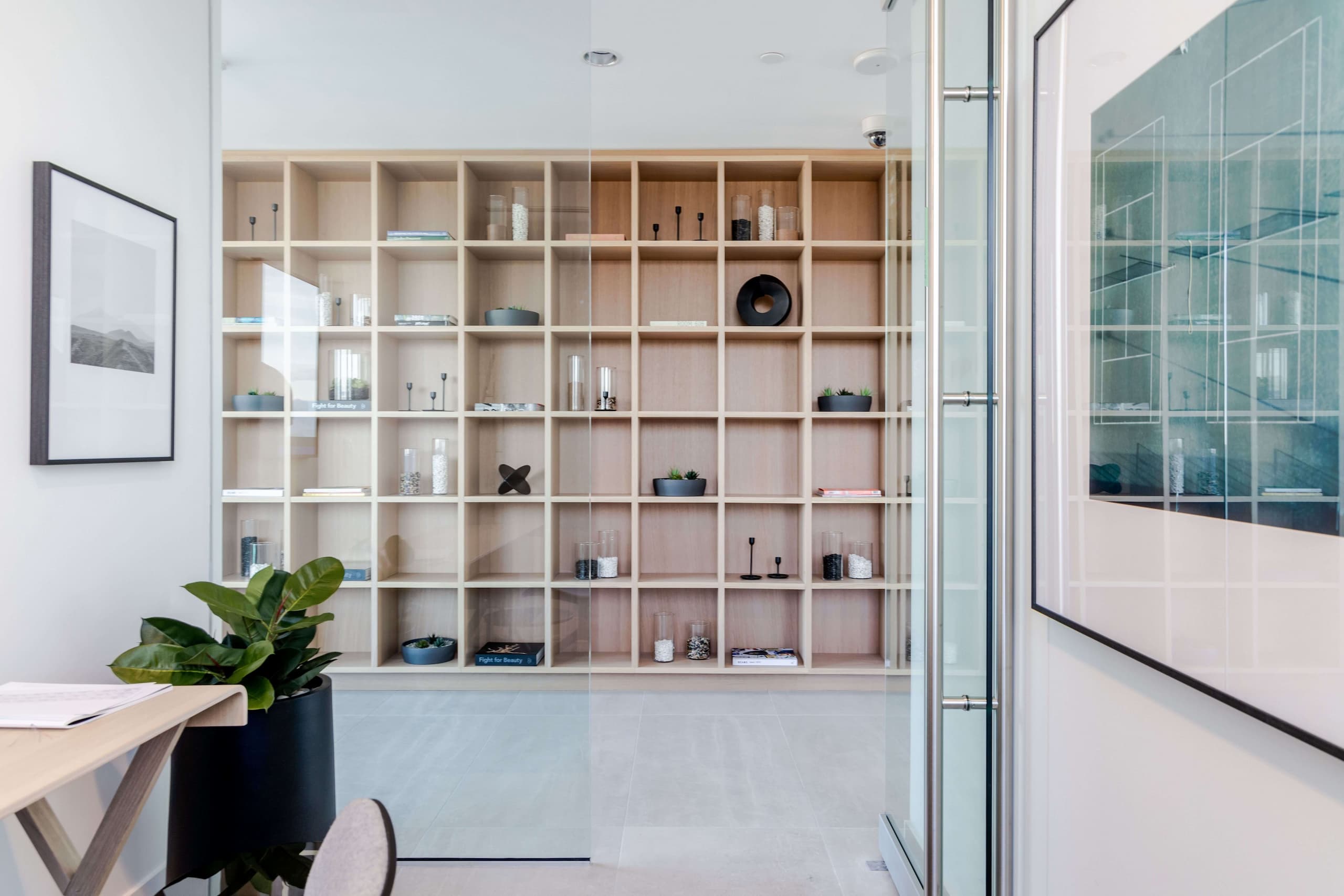 The experience begins with the oversized solid wood suite entry door that provides the security and portal into your home. The neutral tones of the large porcelain floor tile and the white oak kitchen envelope the home in warmth, drawing in the natural light from the expansive windows. The white detailing of the kitchen shelving and countertops provide a crisp counterpoint to the warm palette. The bathroom has been designed to create personal spa experiences. The dusky colour of the walls and floor combined with the custom matte black finish on the fixtures create a relaxed and sensuous mood. The white detailing of the vanities and surfaces provide another layer of continuity across the spaces within the home.